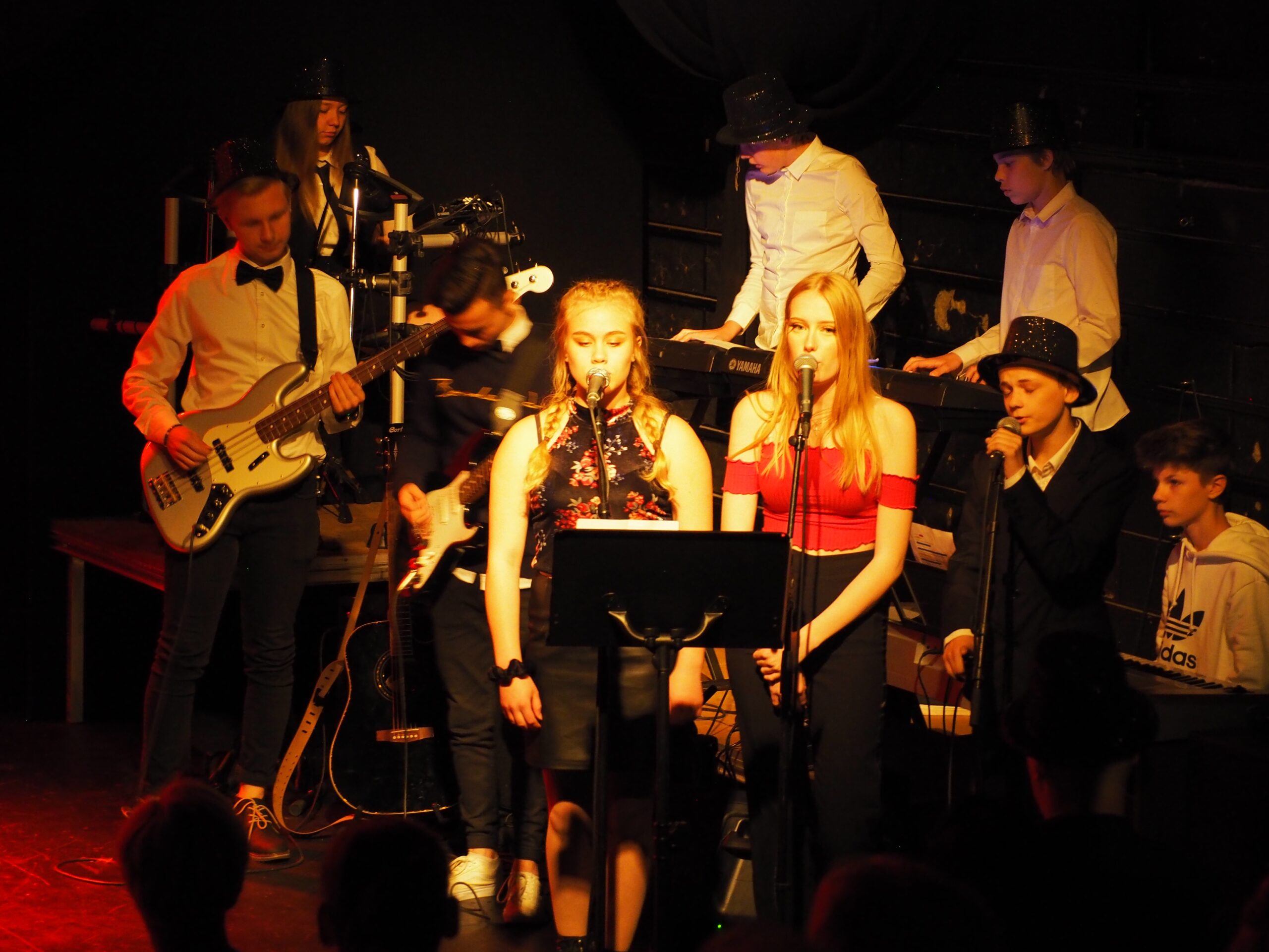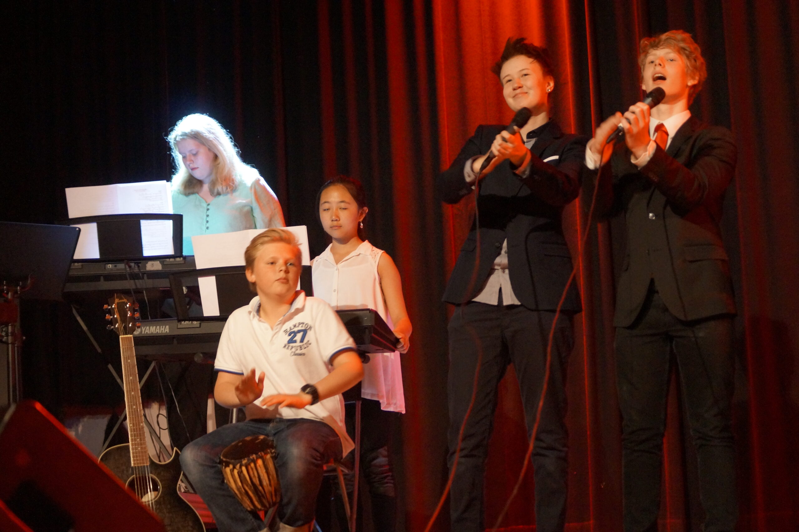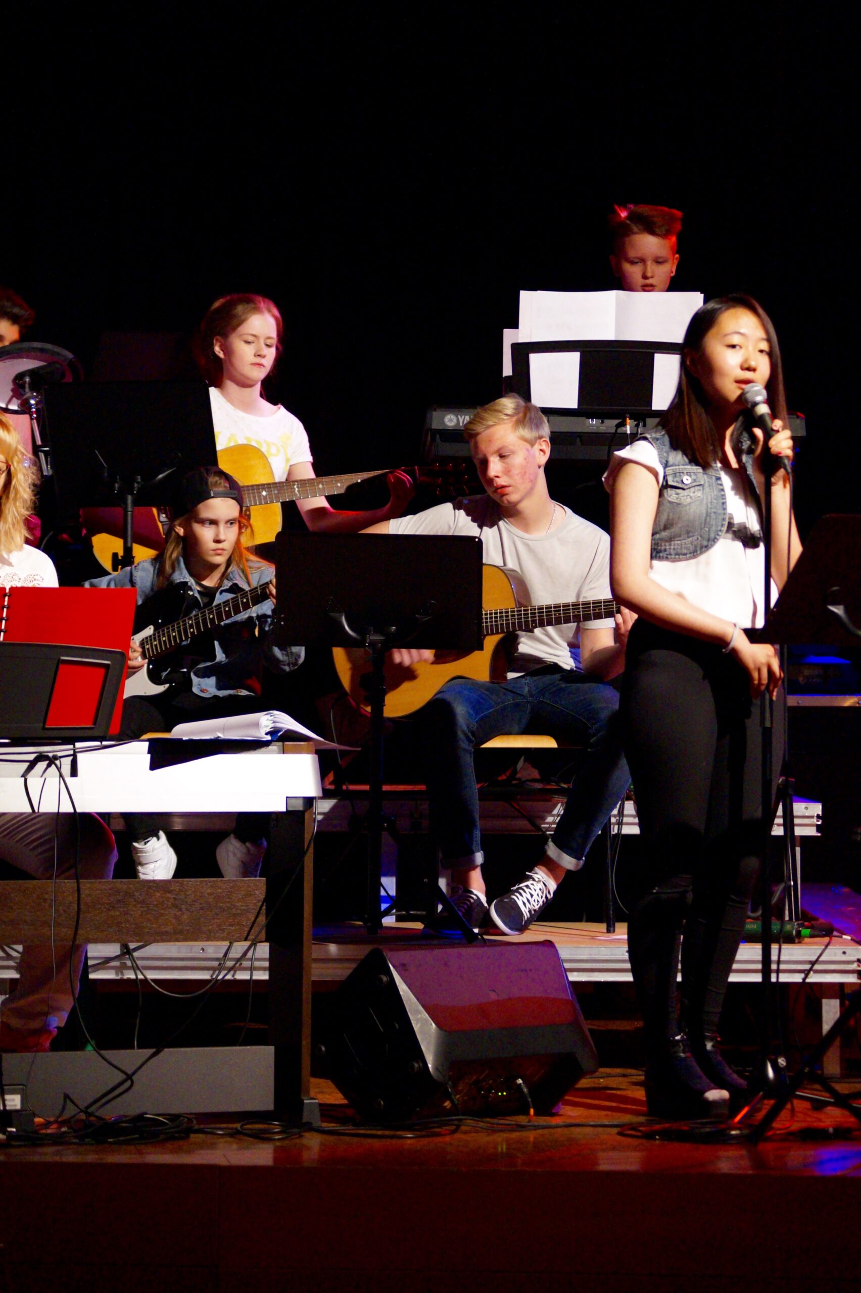 En del av undervisningen leder till musikaliska framträdanden i ensemble, solosång och i kör. Varje år sätts en större scenproduktion upp i samarbete med de andra estetiska profilerna teater, dans och konst där arbete med sceniskt framträdande i sång och ensemblespel är viktiga delar samtidigt som musikens estetiska uttryck tillsammans med andra estetiska uttrycksformer visualiseras. Du får lära dig hur arbetsprocessen ser ut från färdig idé till färdig föreställning med repetitionsarbetets olika stadier samt samverkan mellan dans, koreografi, scenografi, rekvisita, kostym, smink, ljud och ljus.