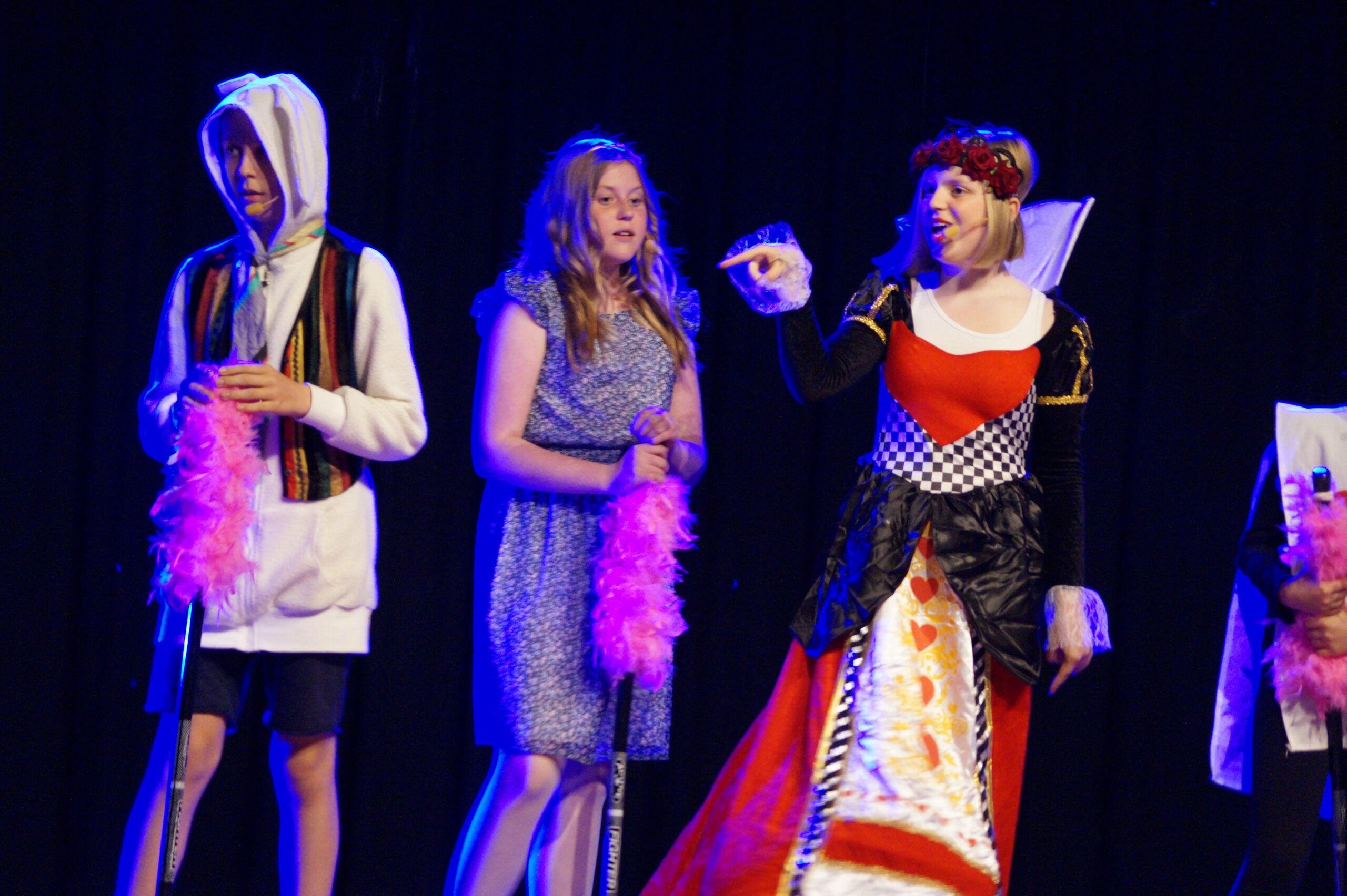 Varje läsår arbetar vi med en större scenproduktion där eleven tillsammans med de andra estetiska profilerna dans, musik och konst. Här får du lära dig hur arbetsprocessen ser ut från idé till färdig föreställning med repetitionsarbetets olika stadier samt samverkan mellan skådespeleri, regi, scenografi, rekvisita, kostym, smink, ljud och ljus. Under arbetet med scenproduktionen ligger fokus på samspelet i gruppen. Här arbetar vi med att skapa sceniska karaktärer genom att bygga upp en rollfigur samt relationen med andra rollfigurer kopplat till tiden och rummet där du använder dig av det du har lärt dig under arbetat med röst, kropp och scenisk gestaltning.